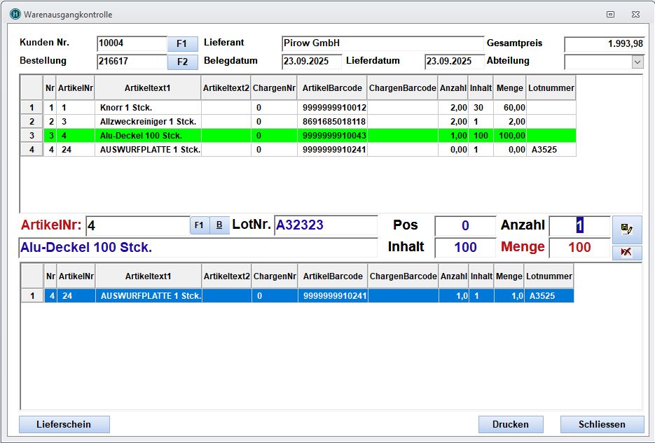 Von der Auswahl einer Kundenbestellung über das Scannen der Artikel bis zur kontrollierten Erstellung des Lieferscheins begleitet Hanware den gesamten Auslieferungsprozess. Fehlmengen, Teilmengen und Chargeninformationen bleiben dabei jederzeit nachvollziehbar und sauber dokumentiert.