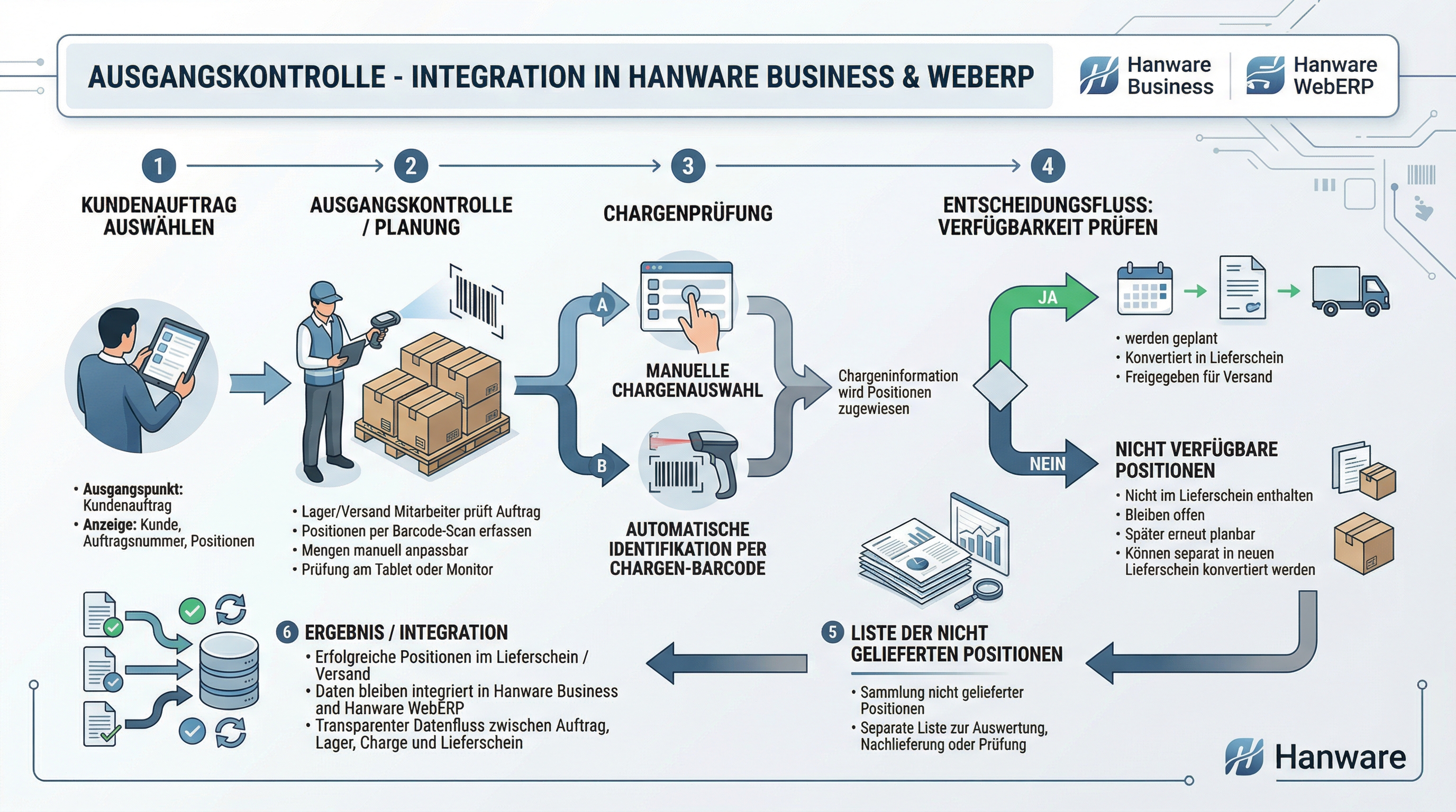 Die Warenausgangskontrolle ist in Hanware Business und Hanware WebERP integriert und unterstützt Sie bei der sicheren Prüfung von Kundenbestellungen vor der Auslieferung. Artikel werden per Barcode erfasst, Chargen geprüft, Mengen angepasst und nur tatsächlich vorhandene Positionen in den Lieferschein übernommen. Nicht verfügbare Artikel können später erneut disponiert oder in einer Liste nicht gelieferter Artikel gesammelt und ausgewertet werden.