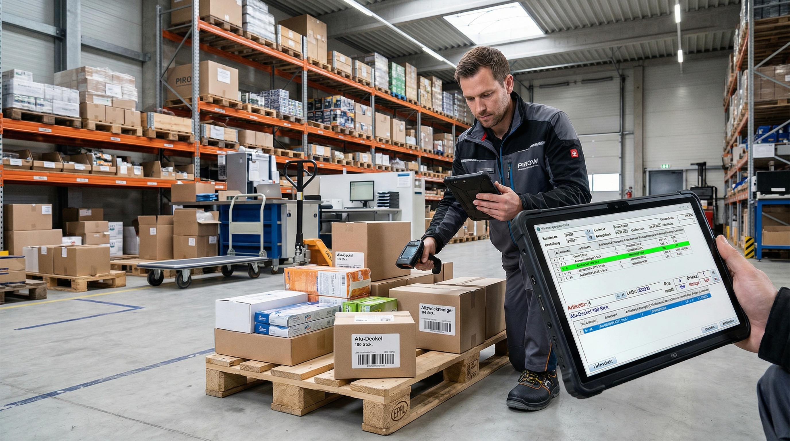 Artikel und Chargen werden per Scan erkannt, Mengen angepasst und sicher für den Versand geprüft.